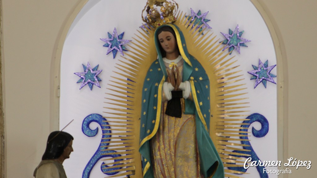 El interior es espacioso y cuenta con un coro alto, cúpula adornada con vitrales, y en los costados es posible apreciar las escenas de las apariciones guadalupanas, pintadas en los muros.